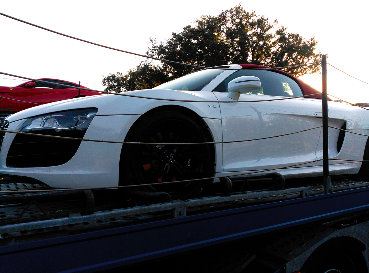 Transporte de Audi descapotável. Caporta vermelha e carro branco metalizado.